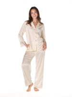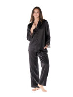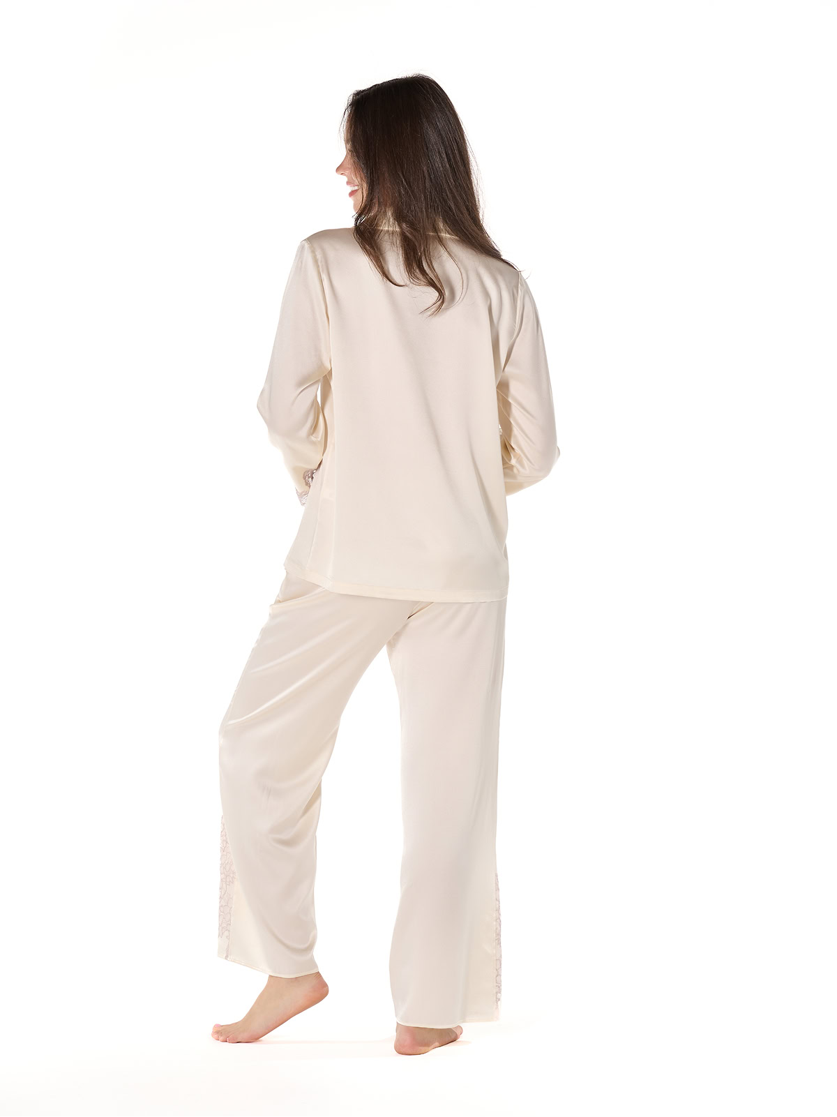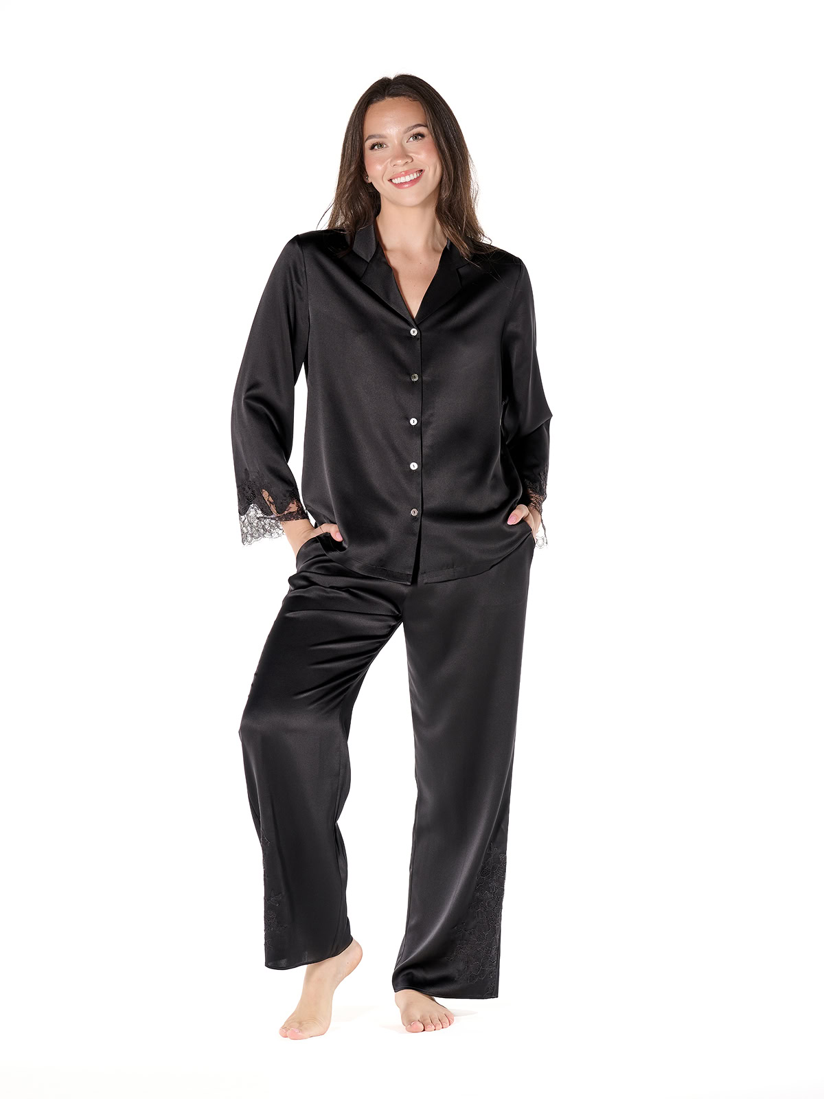 Thoughtfully detailed, it features luminous mother-of-pearl buttons, a fluid silk-spandex blend that moves effortlessly with you through rest, and hand-finished Leavers lace at the cuffs for a whisper of refined softness.