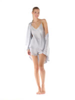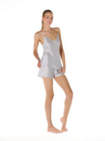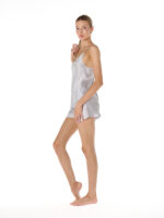 The silver mist camisole features a gentle V-neckline and a soft scoop back that frame the shoulders with grace, creating a piece that feels as beautiful to wear as it is to behold. It captures the essence of modern elegance, draping in a fluid silhouette with a premium feel. Crafted from 100% satin silk in a sand-washed finish, it carries a suede-like softness that lends a subtle texture, one that makes the silver hue glow with quiet radiance.