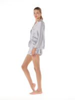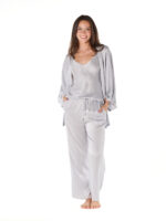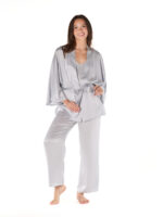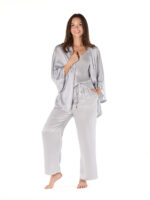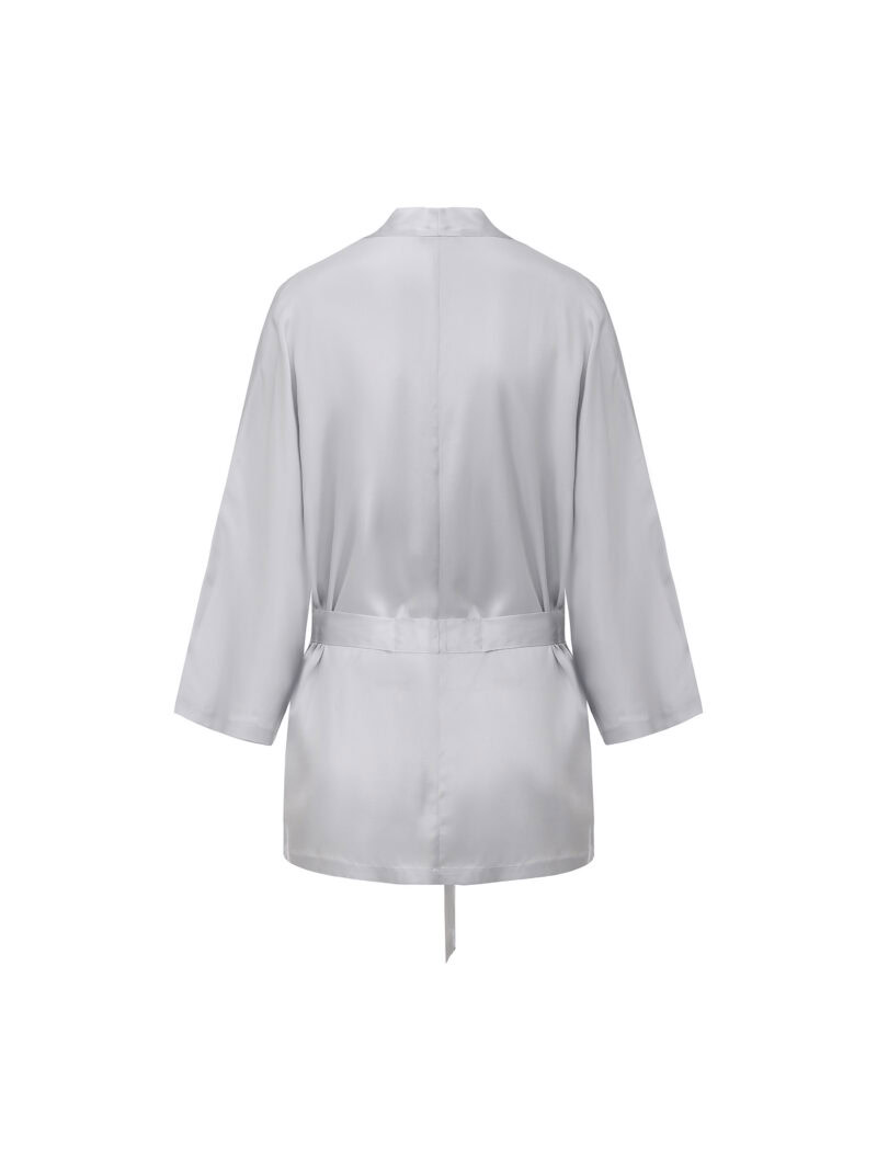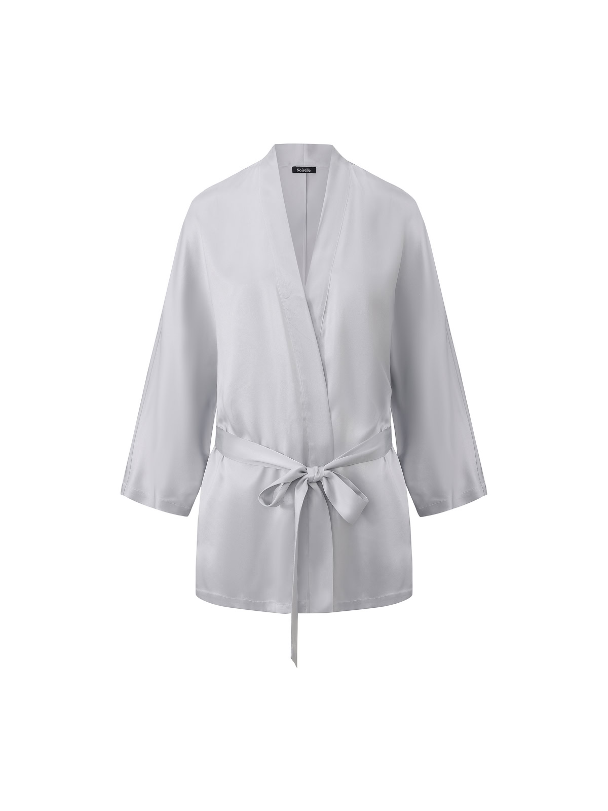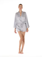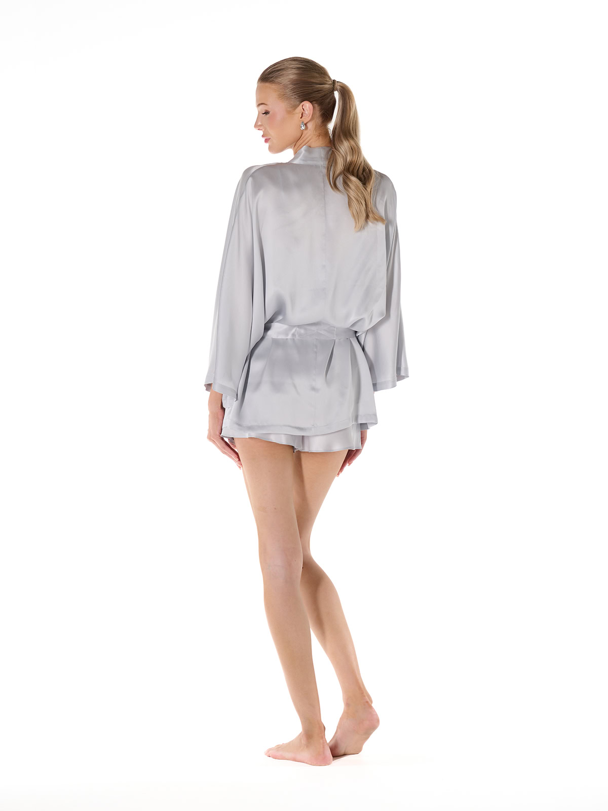 The silver mist kimono pairs effortlessly with any color, making it an essential piece to complete your sleepwear ensemble. Finished with a shawl collar, it features a silk ribbon insert to secure the robe from within and a wide silk belt to cinch the waist with ease. Capturing the essence of modern elegance, it drapes in a fluid silhouette with a premium feel. Crafted from 100% silk in sand-washed satin, it offers a suede-like softness that lends a subtle texture, one that makes the silver hue glow with quiet radiance.